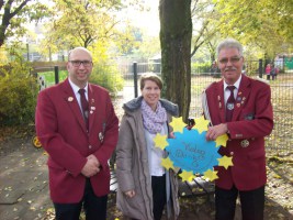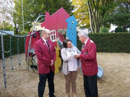 Günther Wenda (rechts), Vorsitzender des Lambertus Corps, und Thorsten Abel überbrachten die Spende den jeweiligen Leiterinnen. Im städtischen Kindergarten nahm Angelika Glund (Mitte) die Spende gerne entgegen. Im Friedrichskothen freute sich Daniela Dengenberg über das Geld. Virginia Jansen vom katholischen Kindergarten ist ebenfalls begeistert.